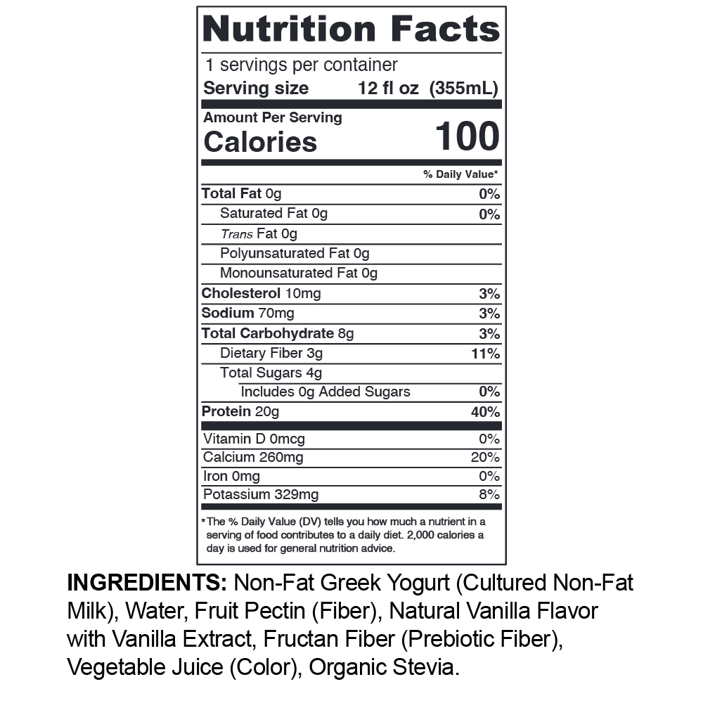 Vanilla = boring? Think again. Our 12 oz Vanilla Drinkable Greek Yogurt blends organic vanilla extract and organic vanilla flavor with a hint of organic stevia for the deepest vanilla essence. We are proud to make our yogurt with milk from pasture-based Northeast family-owned dairy farms.